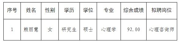 根据《m88 app2022年公开招聘非事业编制心理咨询师公告》,经资格审核、复核及面试工作程序,经学校同意,拟聘赖丽慧1名工作人员,有关事宜公示如下: